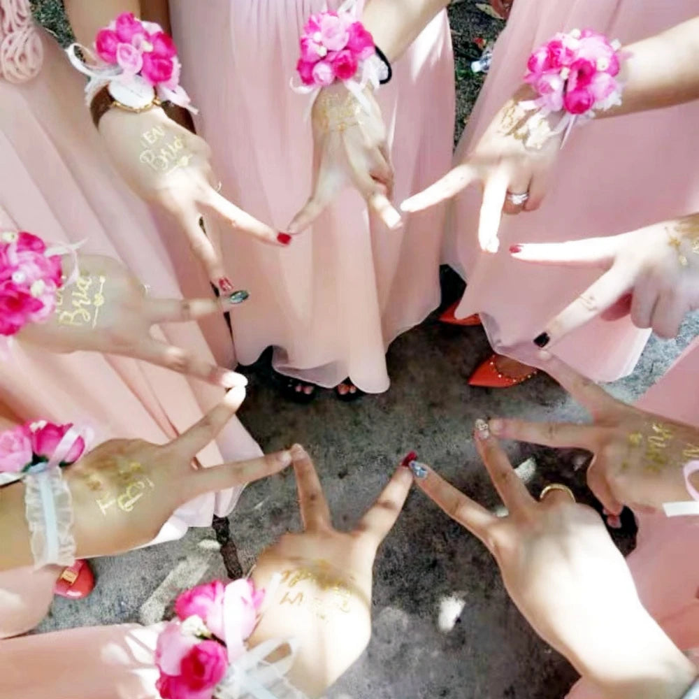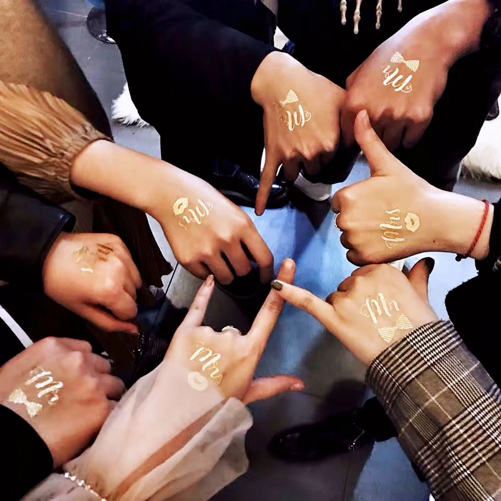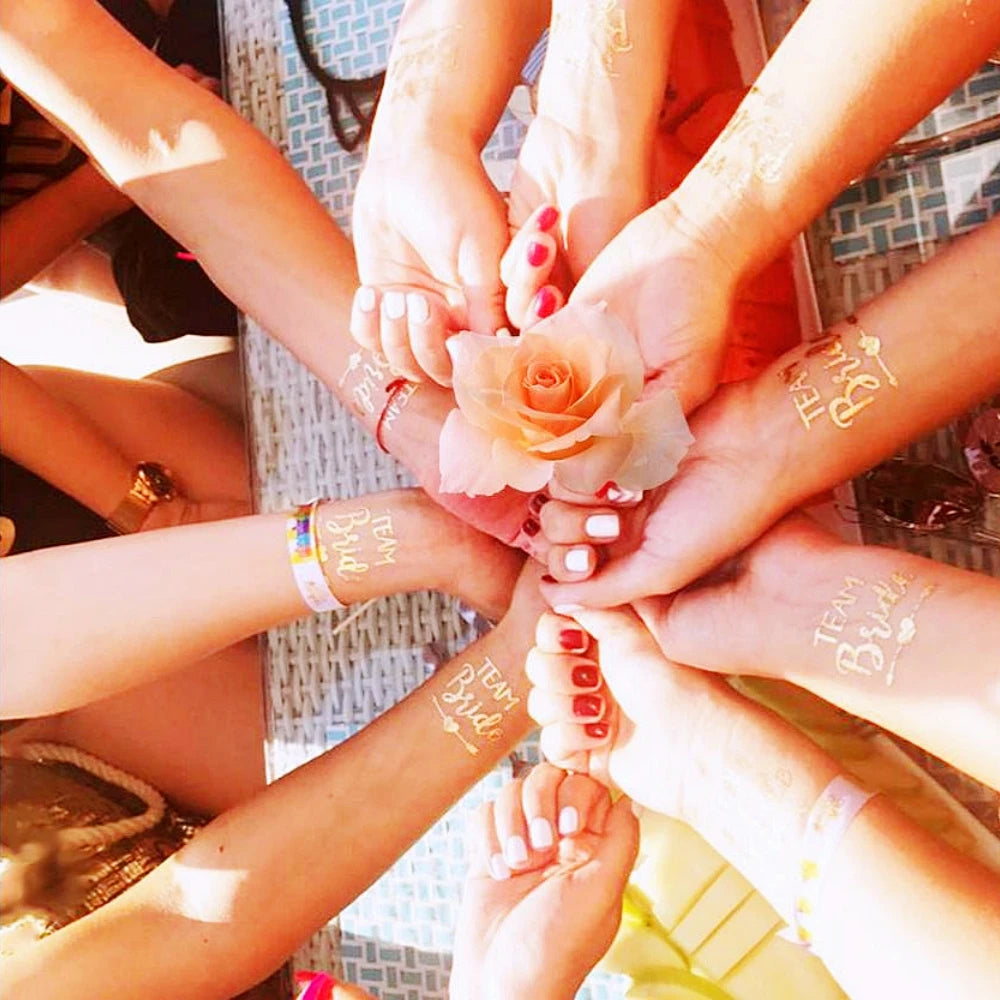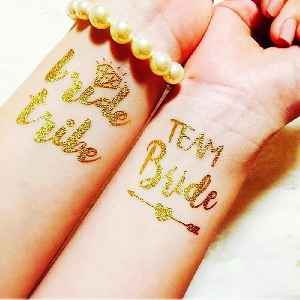 Gold bachelorette tattoos collection boasts a diverse range of chic and on-trend designs that cater to every member of your bride tribe. From elegant typography featuring "Bride Tribe" and "Team Bride to charming symbols like rings, hearts and lips tattoos are ideal accessory to show your unity. Application is a breeze just place the kids team bride tattoo on clean, dry skin, apply a damp cloth for a few seconds, and unveil stunning design.